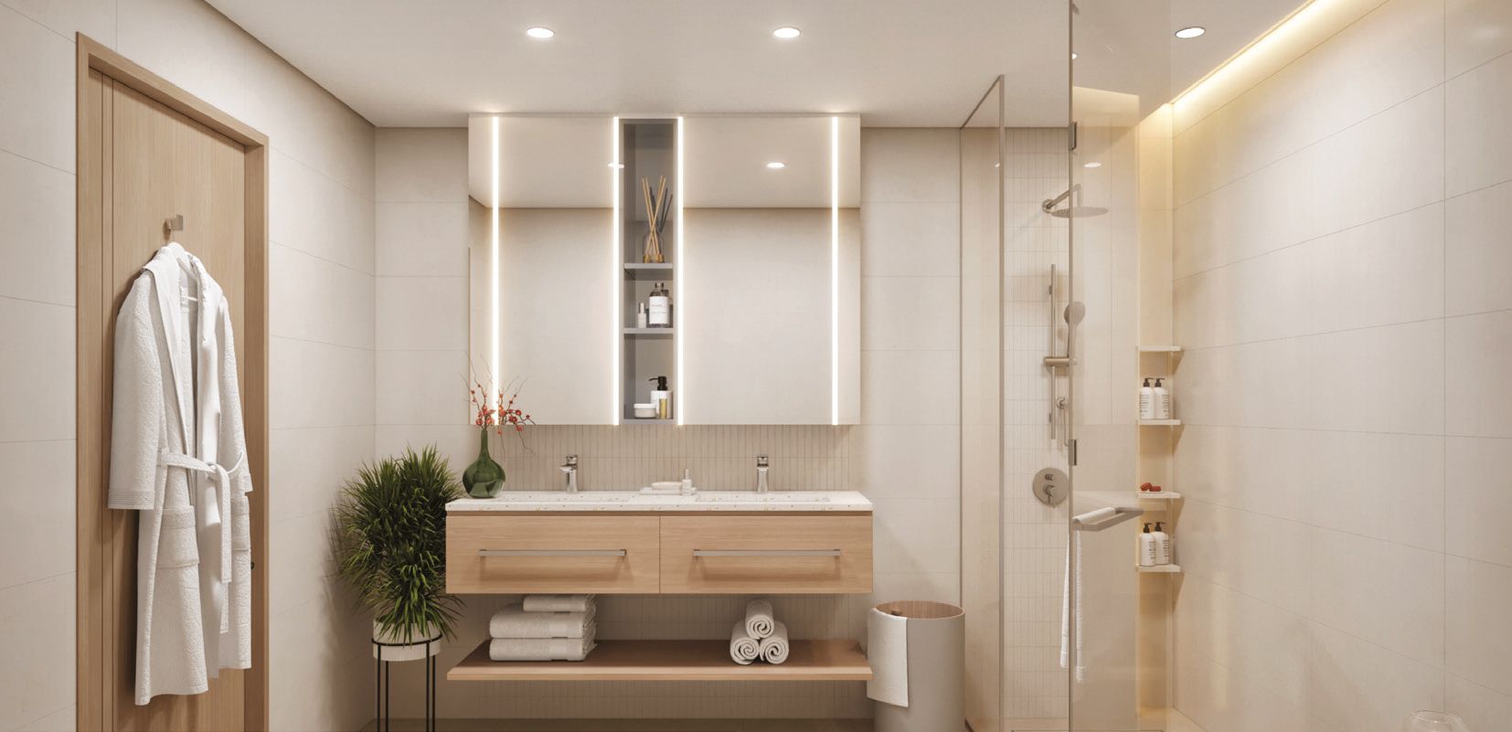Площадь объектов недвижимости варьируется от 42 кв. м до 164 кв. м. Во всех резиденциях есть туалетная комната, прачечная, балкон и кладовая, а в некоторых — рабочее место и/или комната для прислуги. Для всех объектов недвижимости предусмотрены парковочные места: для студий и апартаментов с 1-2 спальнями — по одному, для апартаментов с тремя спальнями — по два.